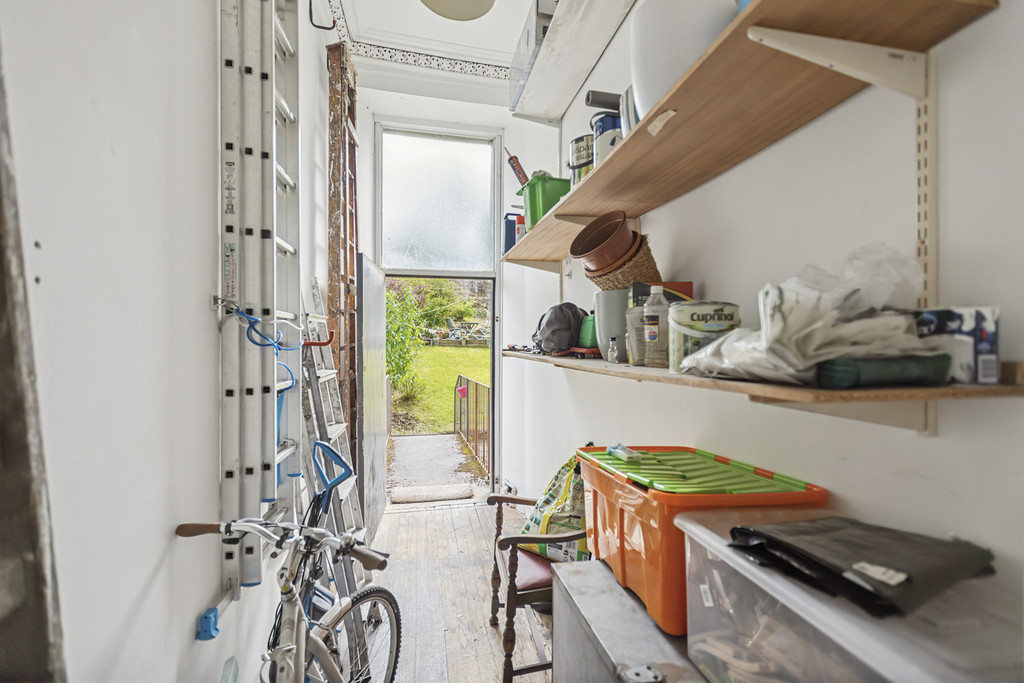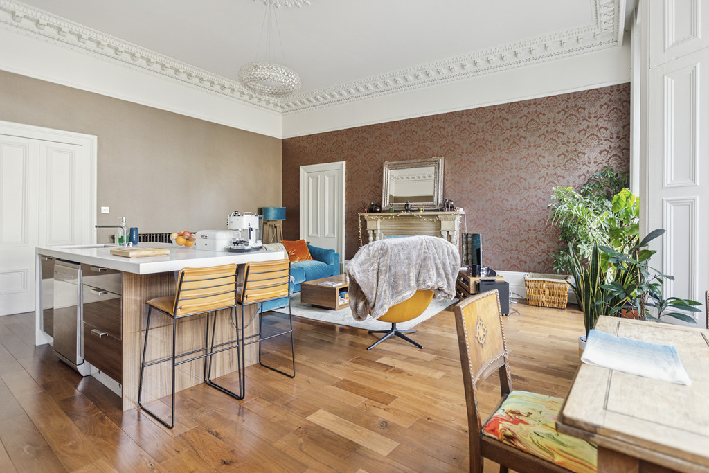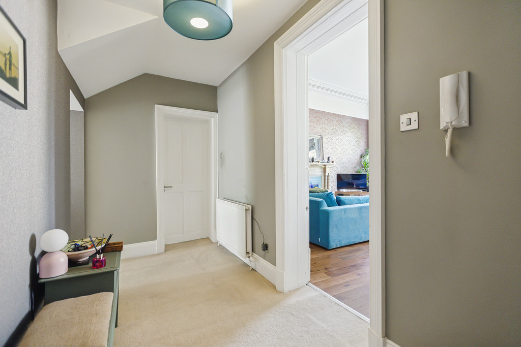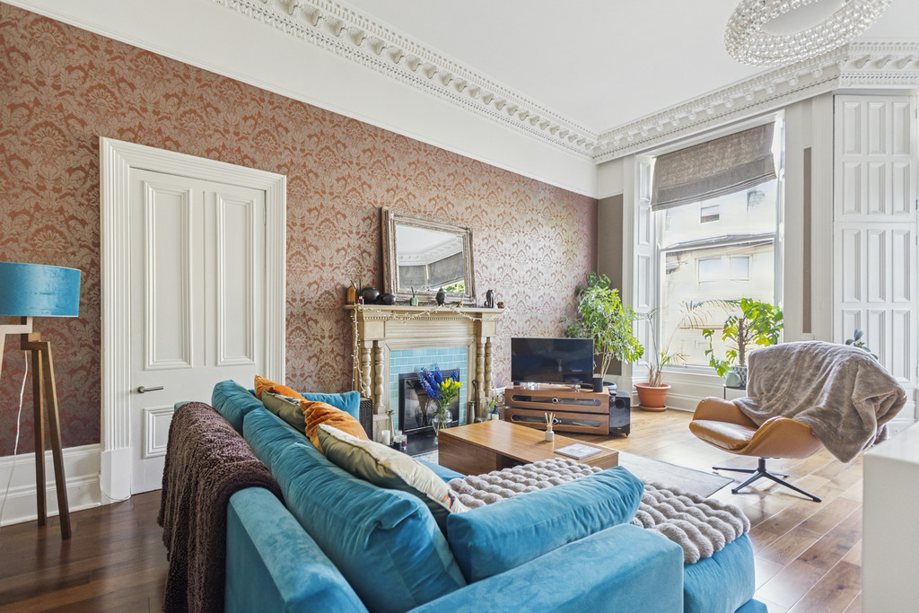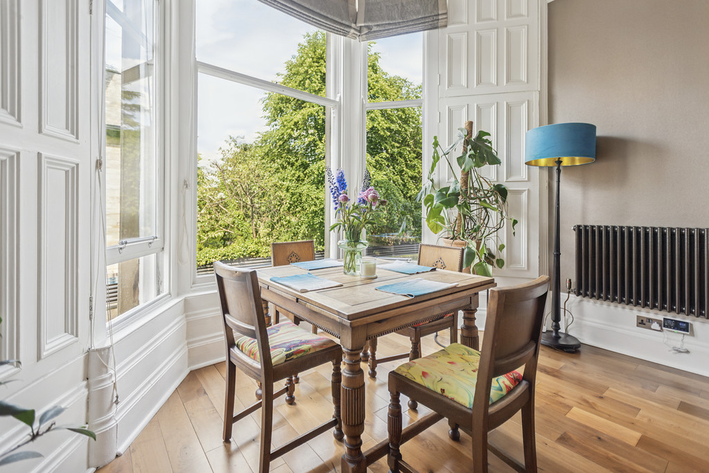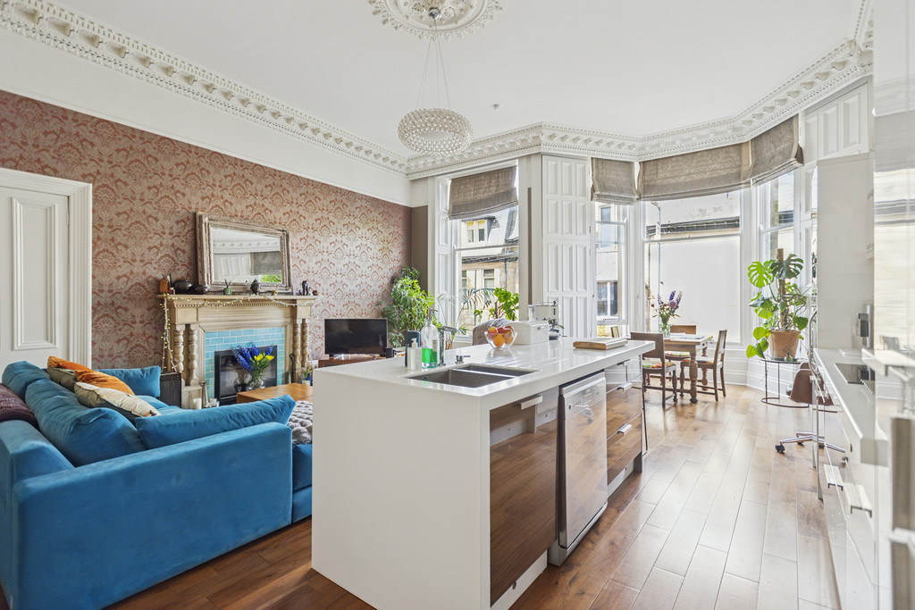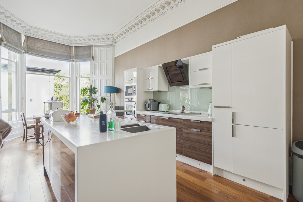 Upon entering, the apartment opens into a welcoming and spacious hallway, complete with a built-in cupboard that provides excellent storage. The living room is a standout feature-bright and generous in size, it is framed by stunning bay windows and an additional single window, flooding the space with natural light throughout the day. A grand feature fireplace with a wood-burning stove adds warmth and character, creating a real focal point. The room's open-plan design leads directly into the fully integrated kitchen. The kitchen is well-appointed with all necessary appliances, ample cupboard space, and a designated dining area, making it ideal for both entertaining and everyday use. Throughout the flat, the windows are sash and case in style and have been upgraded to double glazing, combining period aesthetics with modern efficiency.
