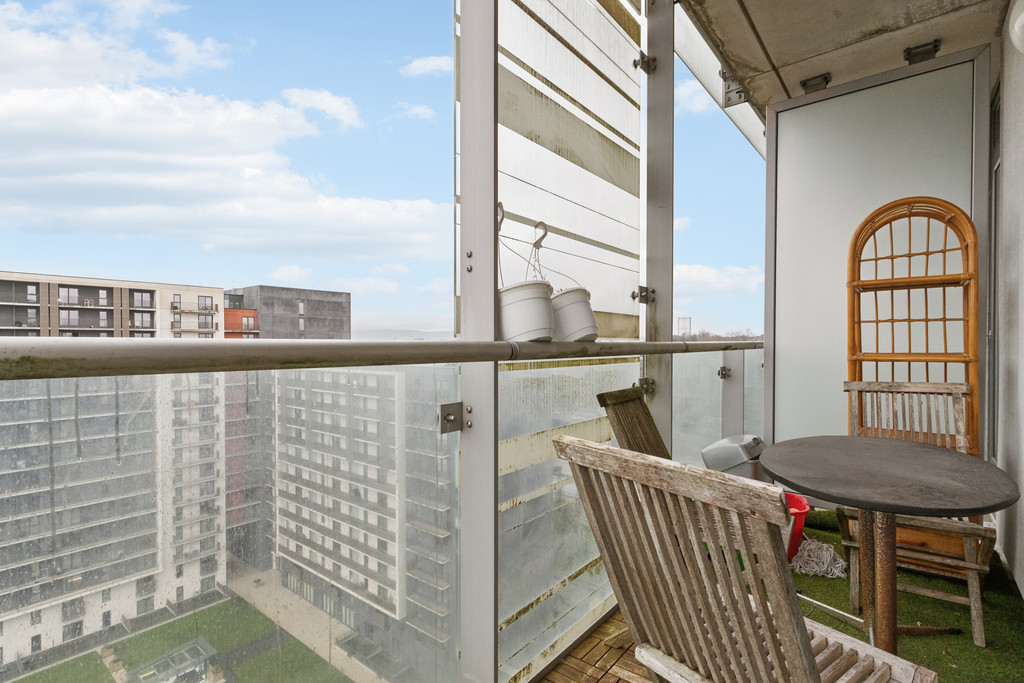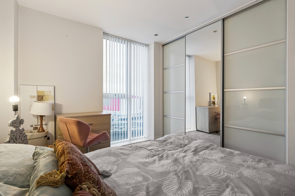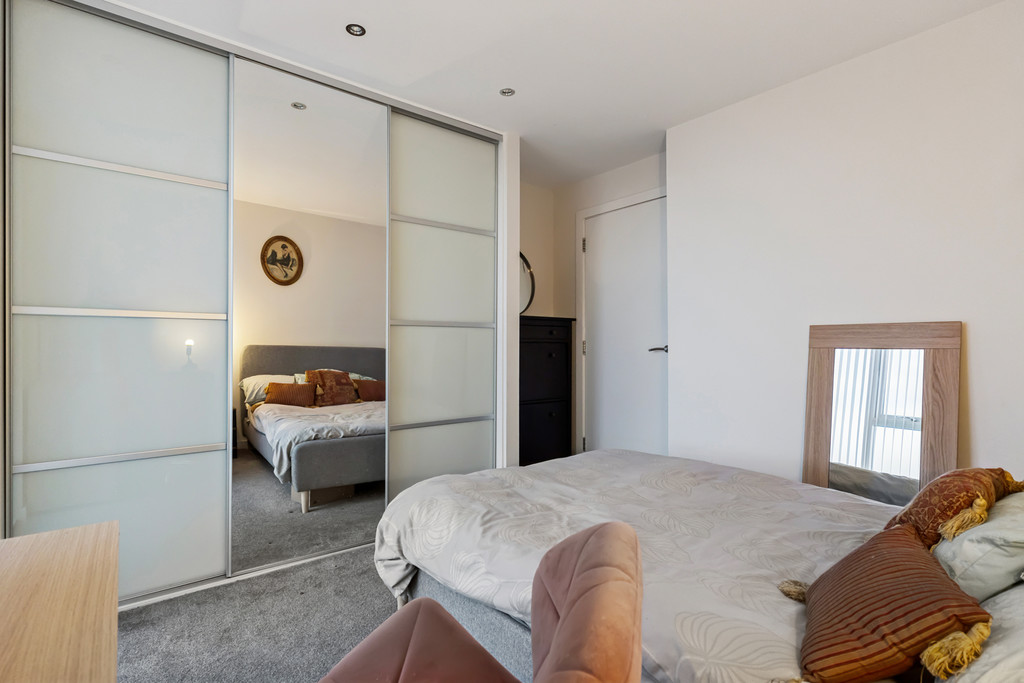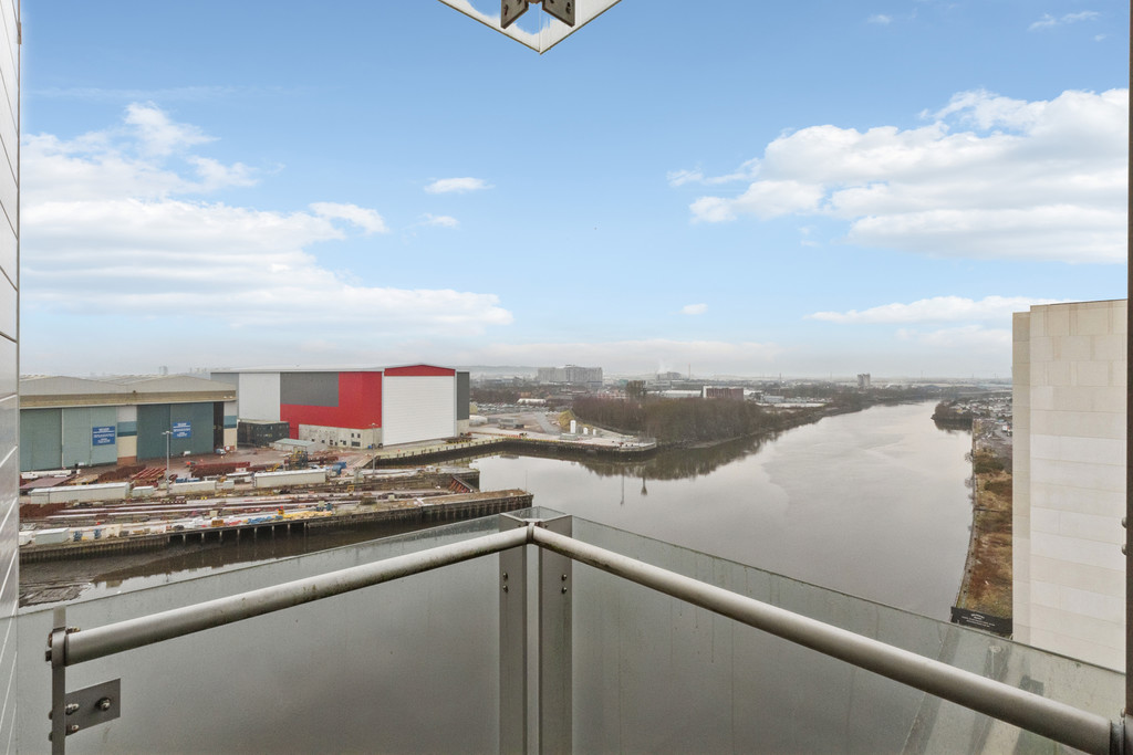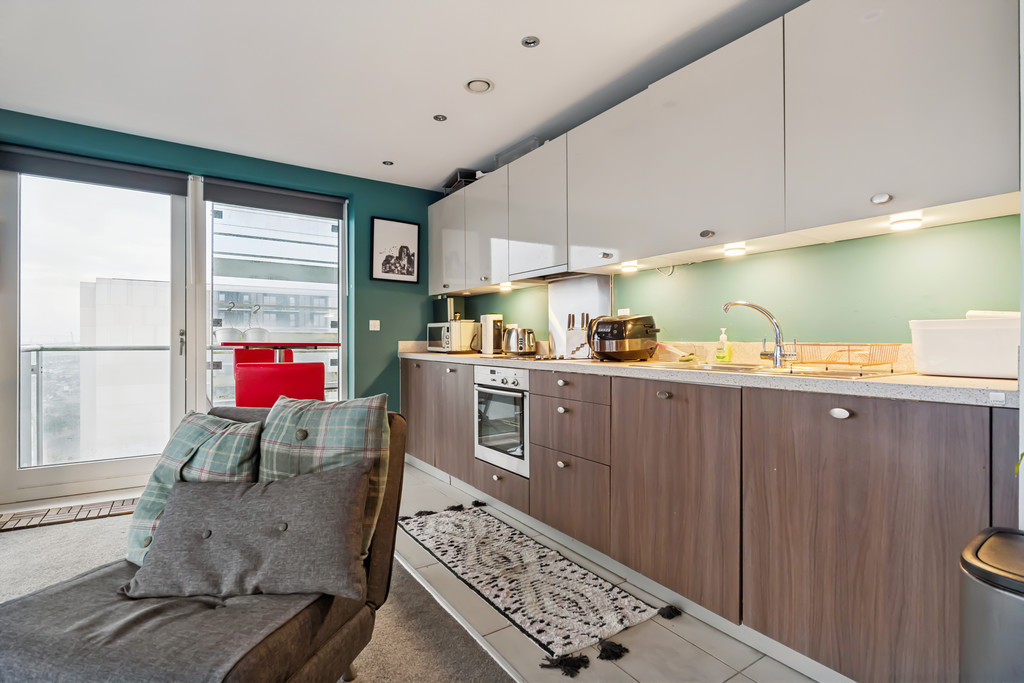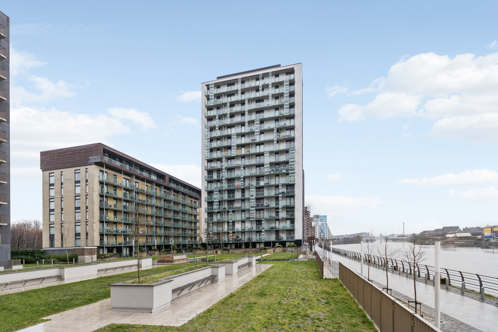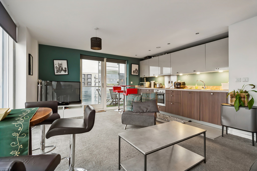 The property is accessed via a welcoming hallway that leads through to a bright and generously proportioned living space. The open-plan living room is enhanced by large double-glazed windows which flood the room with natural light and showcase uninterrupted river views. Ceiling spotlights add a contemporary finish, while direct access to a private balcony provides an ideal spot to enjoy the scenery outdoors. The living area flows seamlessly into the kitchen, creating a sociable and modern layout. The fully integrated kitchen is well equipped with all necessary appliances and benefits from a good amount of cupboard space, making it both practical and stylish. The double bedroom is well-sized and features built-in sliding wardrobes, along with space to accommodate a desk, ideal for home working. The bathroom is finished with a modern three-piece suite, including a shower/bath combo. Further benefits include a well-maintained communal building, attractive communal garden grounds, and a private parking space.