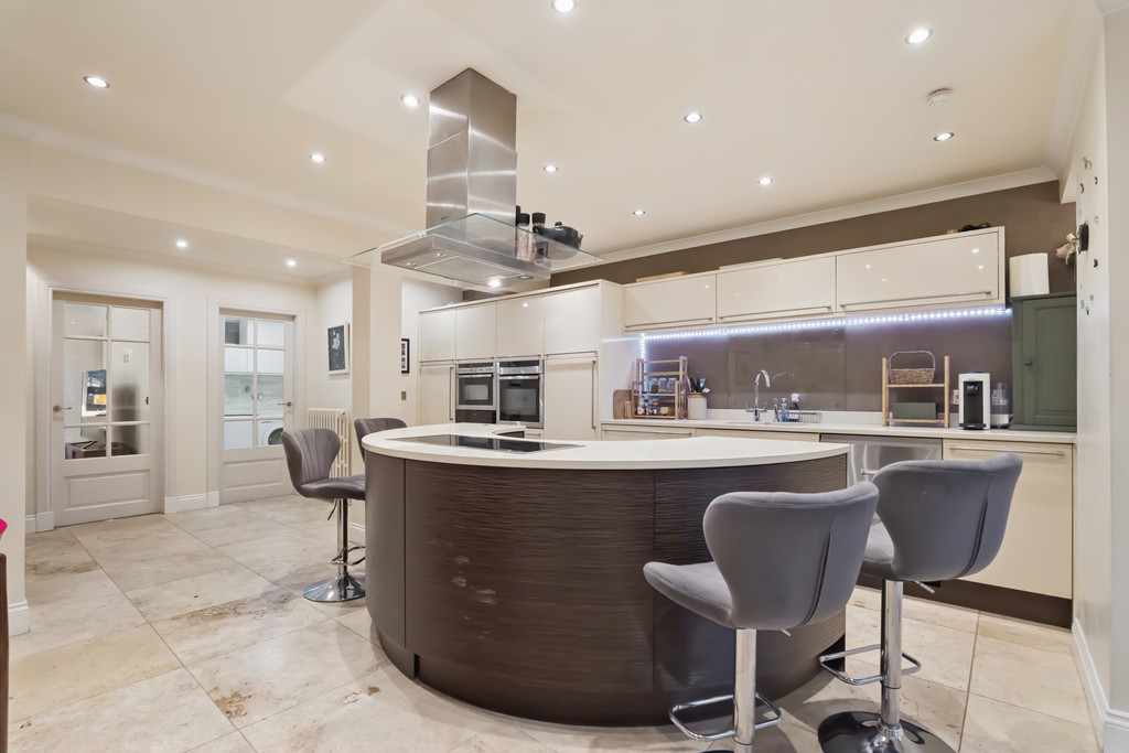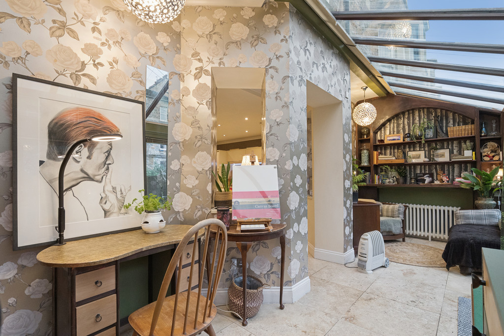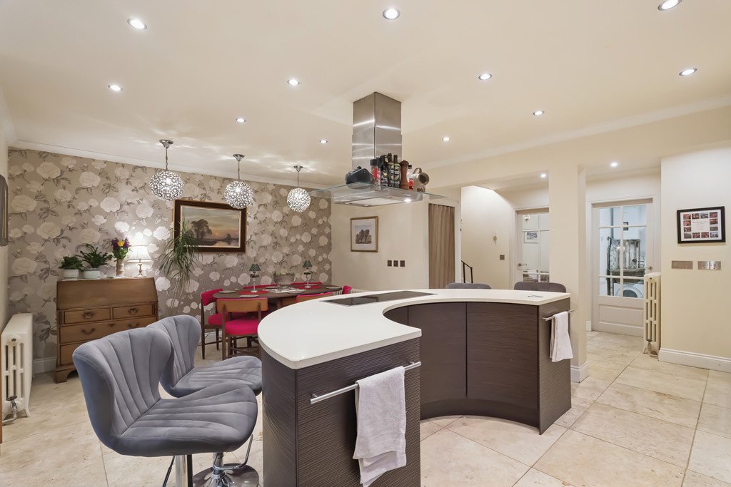 The lower-level layout comprises a family room, three-piece bathroom, spacious utility room -with WC- and an impressive, generously sized kitchen. The kitchen is well-equipped with all-necessary integrated appliances and the curved kitchen island is perfectly paired with the dining area creating the perfect space for hosting family and friends. The kitchen also provides open-plan access to the lean-to sunroom to the rear with access to the garden. It should be noted that planning permission has been granted to replace the current sunroom. The property also benefits from an excellent private garden which faces south and east.