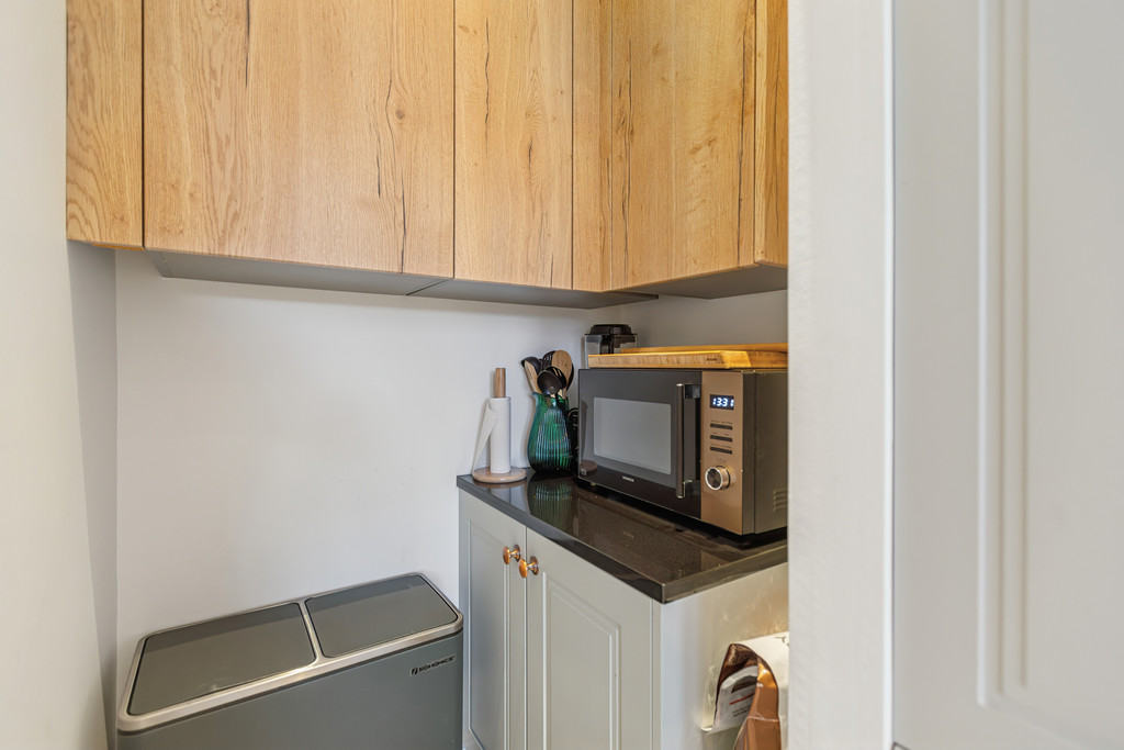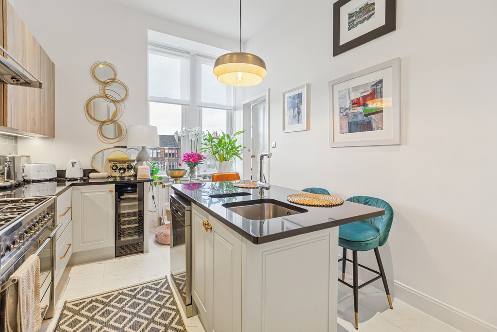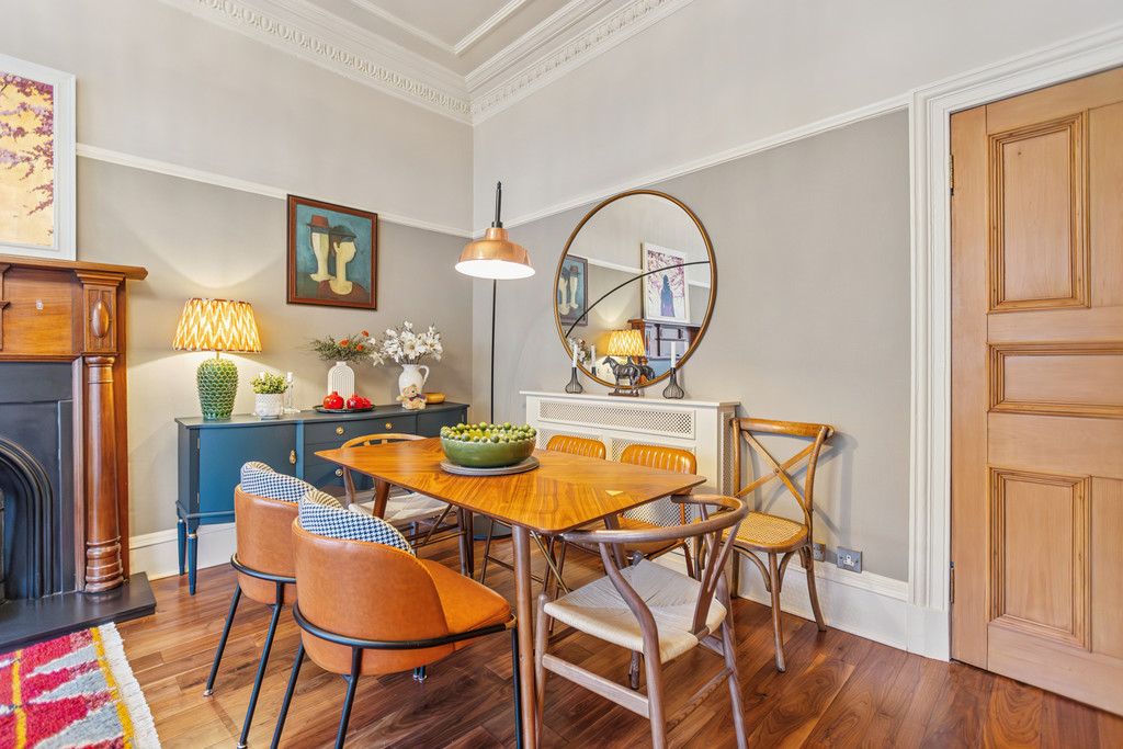 Accessed via well-maintained storm doors and an impressive stained-glass internal door, the home immediately sets a tone of quality. The welcoming hallway provides excellent built-in storage and leads to all principal rooms, with engineered wood flooring flowing seamlessly throughout and intricate cornicing adding a decorative touch. The outstanding living room is truly special, ideal for both relaxing and entertaining. A feature fireplace forms a focal point, while stunning refurbished sash and case bay windows flood the room with natural light. The generous proportions easily accommodate a dining area, making this a wonderfully sociable setting. The master bedroom is particularly impressive, benefitting from replacement conservation-standard double-glazed windows complete with period ironmongery, ensuring comfort without compromising character. Two built-in storage cupboards provide practical convenience. The second bedroom is substantial in size, offering ample space for standalone furnishings and flexible use. The third bedroom, currently utilised as a peaceful home office, features its own fireplace and provides a calm retreat. The kitchen is well-appointed and thoughtfully designed, equipped with all necessary appliances including a striking range cooker. A central island with breakfast bar enhances both functionality and style, while ceiling spotlights provide excellent lighting. There are two beautifully finished bathrooms. The main bathroom is completed to an excellent standard and features a shower-over-bath combination and bidet, while the additional bathroom offers a contemporary three-piece suite with walk-in shower. Externally, the property benefits from a well-maintained communal close adorned with elegant tiling and secure door entry, further reflecting the care and attention given to this exceptional building.