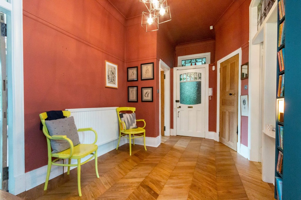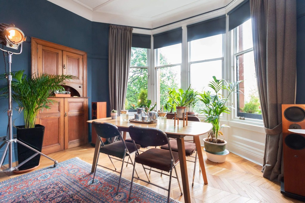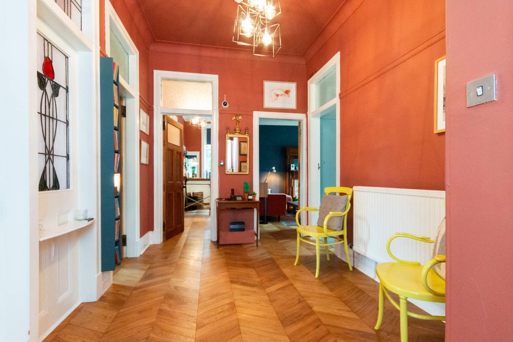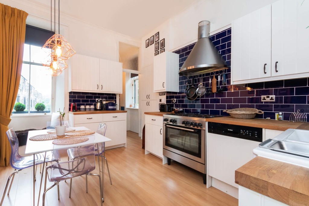 The building has security entry and the common close is smart and traditional. The accommodation comprises; large reception hall with stunning herringbone flooring, stain glass to the cloaks area & storage cupboard, secondary hall with mural wallpaper offering a useful office/work station and 2 side facing windows, impressive formal lounge with 4 bay window, period features, herringbone flooring and feature fireplace, stylish dining kitchen with solid timber work tops, subway tile splash-backs, range cooker and hood and window seat, bright utility room again with solid timber worktops, large master bedroom with stunning uncovered fireplace, herringbone flooring, a 4 bay window and period features, 2 further excellent double bedrooms and to complete the layout there is a very stylish 3 piece bathroom with Victorian style over-bath shower and designer Timorous Beasties wallpaper . The property has gas central heating, refurbished sash and case windows and there is on-street resident permit parking which come into operation on 26th August which will be transformative for local residents with regards to parking provision. Station Park and Hillhead sports Club at Hughenden are both only 1-2 minutes walk together with the extensive selection of amenities, transport and leisure on your doorstep. It should be noted that this flat is available fully furnished including light fitments. This commanding, double bay windowed, sandstone, 3 bedroom west end apartment is sure to impress with its newly designed interior, spacious proportions, period features, central location and also the cul de sac position which should attract young professional families and downsizers alike. The perfect example of a larger style Hyndland sandstone tenement flat.