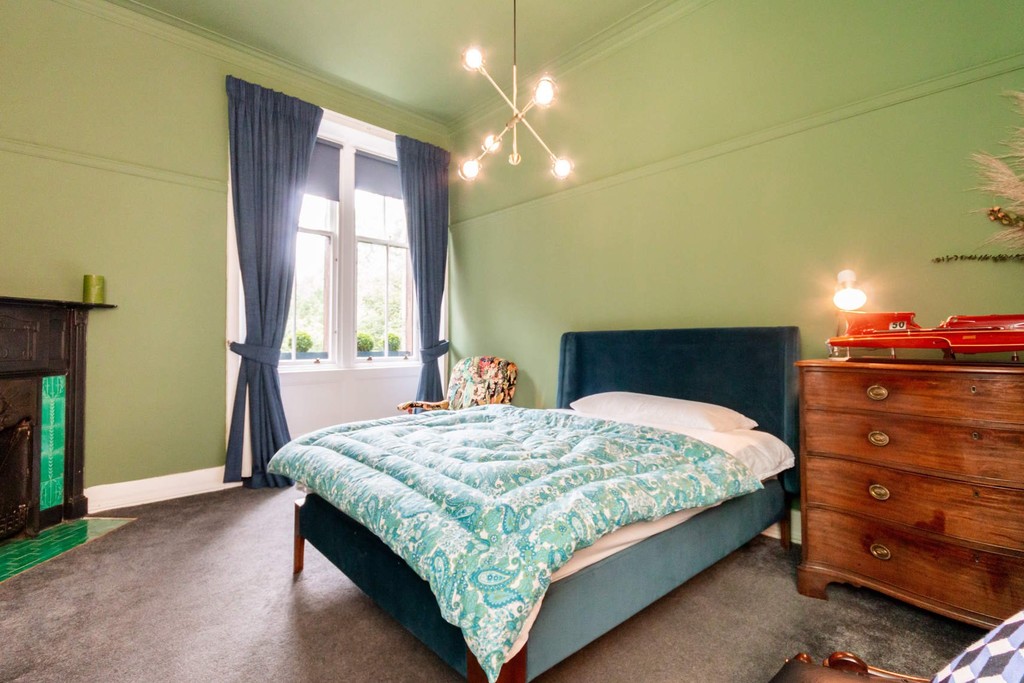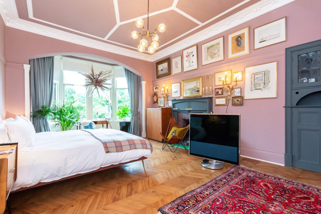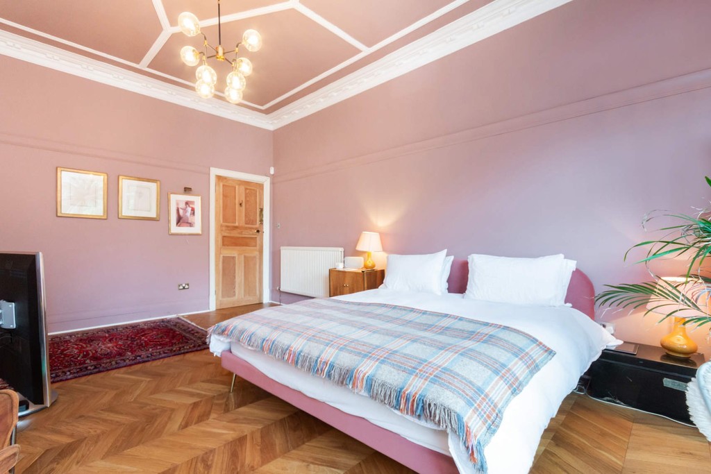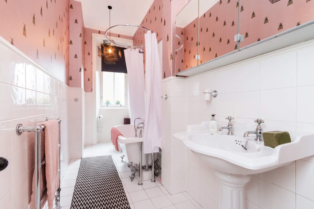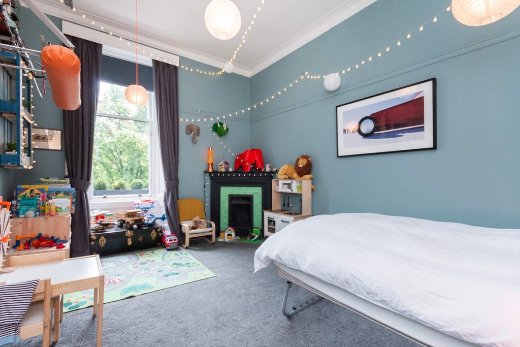 The building has security entry and the common close is smart and traditional. The accommodation comprises; large reception hall with stunning herringbone flooring, stain glass to the cloaks area & storage cupboard, secondary hall with mural wallpaper offering a useful office/work station and 2 side facing windows, impressive formal lounge with 4 bay window, period features, herringbone flooring and feature fireplace, stylish dining kitchen with solid timber work tops, subway tile splash-backs, range cooker and hood and window seat, bright utility room again with solid timber worktops, large master bedroom with stunning uncovered fireplace, herringbone flooring, a 4 bay window and period features, 2 further excellent double bedrooms and to complete the layout there is a very stylish 3 piece bathroom with Victorian style over-bath shower and designer Timorous Beasties wallpaper . The property has gas central heating, refurbished sash and case windows and there is on-street resident permit parking which come into operation on 26th August which will be transformative for local residents with regards to parking provision. Station Park and Hillhead sports Club at Hughenden are both only 1-2 minutes walk together with the extensive selection of amenities, transport and leisure on your doorstep. It should be noted that this flat is available fully furnished including light fitments. This commanding, double bay windowed, sandstone, 3 bedroom west end apartment is sure to impress with its newly designed interior, spacious proportions, period features, central location and also the cul de sac position which should attract young professional families and downsizers alike. The perfect example of a larger style Hyndland sandstone tenement flat.