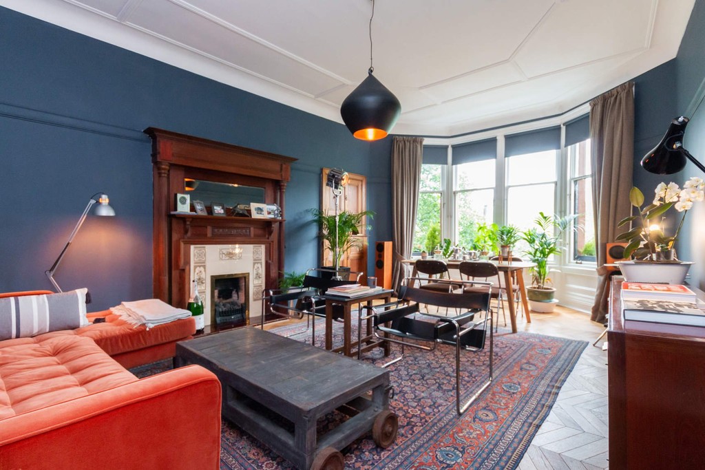 Super stylish double fronted 3 bedroom red sandstone tenement apartment formed on the 2nd floor in a cul de sac location on the highly desirable, tree-lined Lauderdale Gardens with open views over trees and parkland in the leafy west end district of Hyndland.