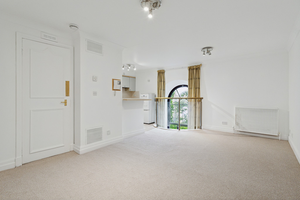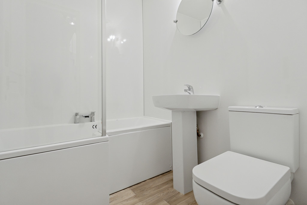 The accommodation comprises; reception hall with access to the stylish 3 piece bathroom with over-bath shower and 2 double bedrooms which both have fitted storage. Upstairs there is a well laid out L-shaped lounge/dining kitchen space with impressive feature full height window & breakfast bar together with 2 storage cupboards.