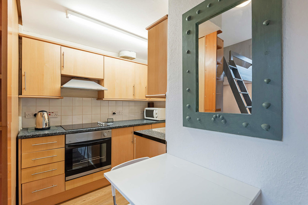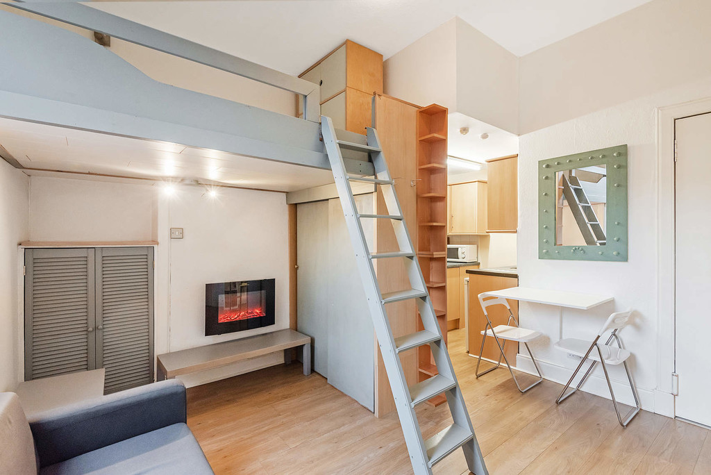 The building is entered via security entry and the accommodation comprises; reception hall with storage, lounge with open-plan kitchen, space to dine, a seating area with feature fireplace, fitted wardrobes and a mezzanine sleeping space. The layout is completed by the shower room off the studio and a separate wc from the hall. The property benefits from electric heating, double glazing, access to a sizeable store room, resident permit parking and a south facing maintained courtyard to the rear of building.